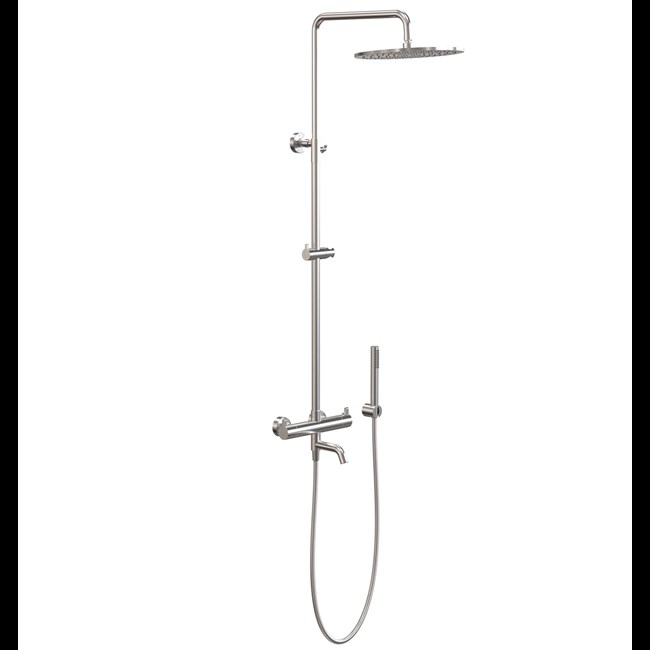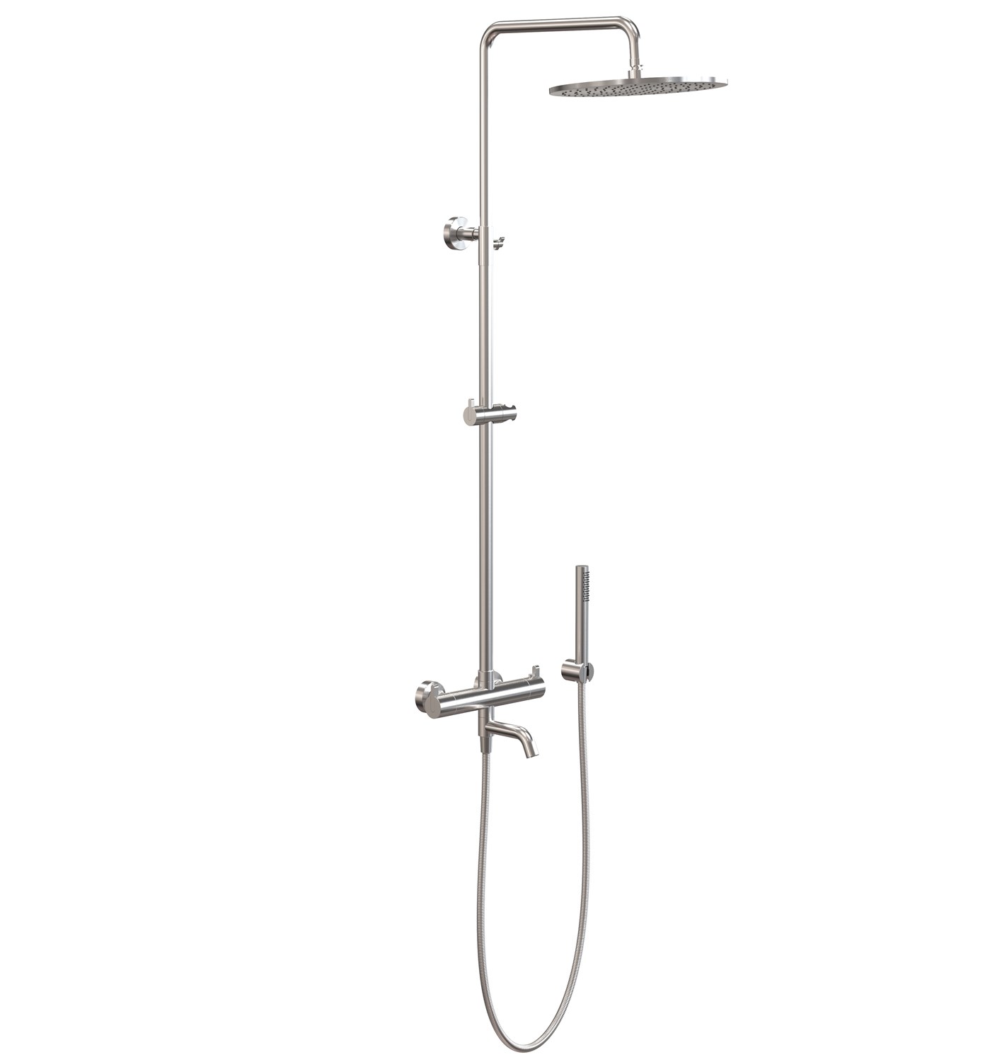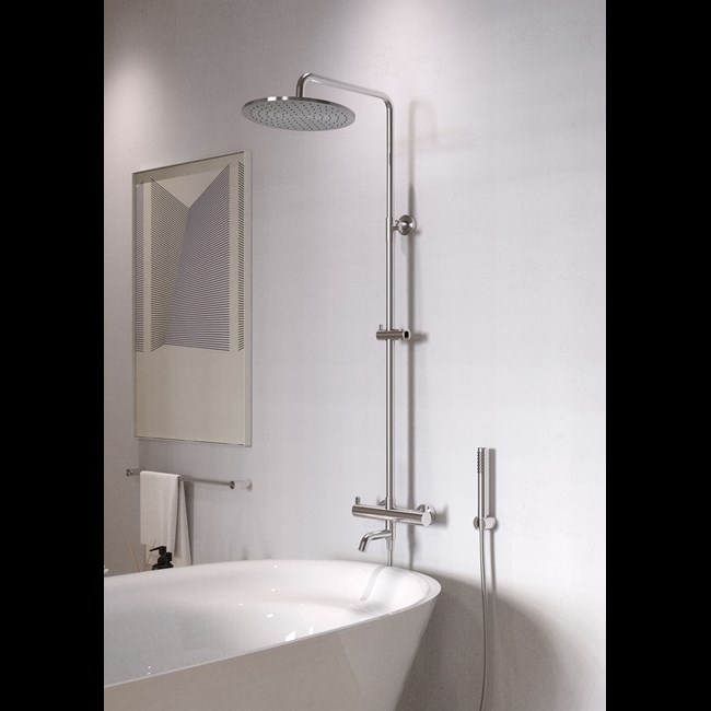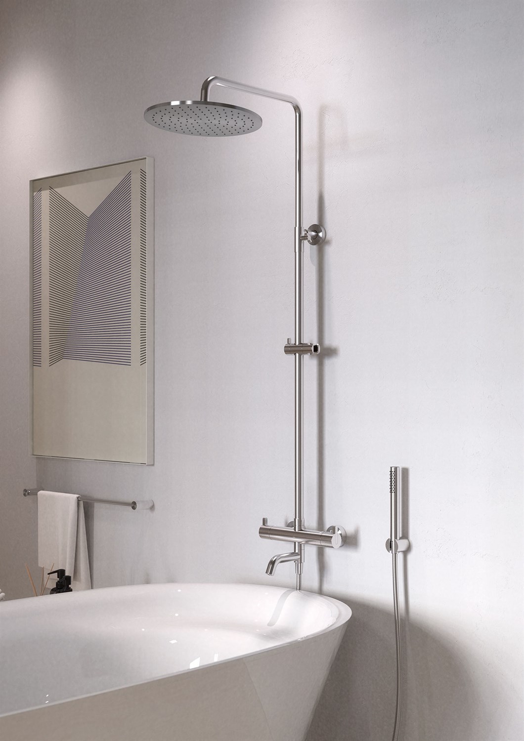 Cet ensemble de douche unique est la pièce maîtresse qui sublimera votre salle de bain. Fabriqué en acier inoxydable, il garantit durabilité et qualité optimale. Il comprend une douchette, une douche de tête effet pluie et un mitigeur thermostatique pour une température d'eau constante. Les neuf finitions Frost permettent d'adapter cet ensemble à toutes les salles de bain. Avec son design séduisant et sa grande fonctionnalité, le SYSTÈME DE DOUCHE 1986 allie praticité et esthétique. Associé aux autres produits Frost, il permet de créer facilement une ambiance harmonieuse. Cet ensemble s'intègre également parfaitement à votre décoration existante. Disponible à partir de septembre 2026.