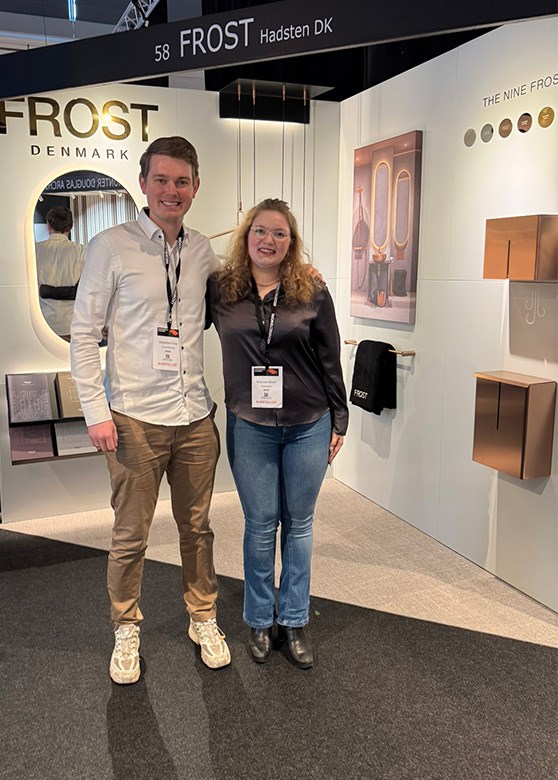 Stine and Dorthe at Stockholm Furniture Fair 2023. Behind them is a wall decorated with various UNU shelves and mirrors