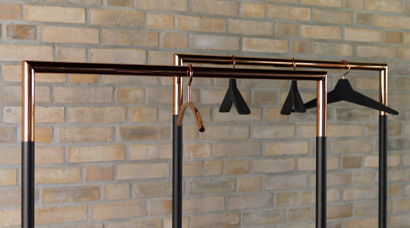 Het BUKTO kledingrek is beschikbaar in mat zwart en mat wit met details in gepolijst roestvast staal, gepolijst koper, gepolijst goud of gepolijst zwart.