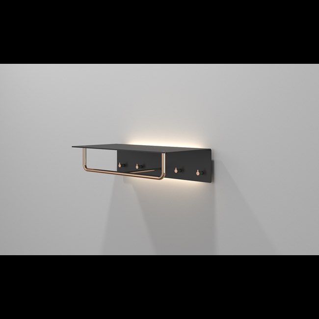 Hattehylle med 4 kroker og klesstang. Hattehyllen med LED-bakplate gir garderoben stemningsfull belysning rundt hattehyllen. Hyllen finnes også i 200 mm med 2 kroker og 1000 mm med 6 knagger. Elegant oppbevaring av klær i garderoben. Alle FROST garderobehyller har unike design du ikke finner andre steder. Fokus er ikke bare på kvalitet og funksjon, men også på estetikk og stil. Med FROST får du en vakker hylle med et karakteristisk, skulpturelt uttrykk som vil komplementere ethvert moderne hjem. For dem som verdsetter estetikk og ønsker å tilføre personlighet og kreativitet til hjemmet, tilbyr vi modeller med ulike overflater. De passer perfekt inn i både klassiske og moderne hjem eller kontorer. I tillegg kan hyllene kombineres med resten av vårt sortiment av FROST produkter til entré og garderobe – for eksempel våre kleshengere, skohyller, stumtjener eller speil. Alle disse møblene vil se elegante ut i entréen og ønske deg og dine gjester velkommen. Hyllen leveres komplett med LED-bakplate U4000-600 og transformator. LED fargetemperatur: 2700K. Settet leveres i 2 esker.