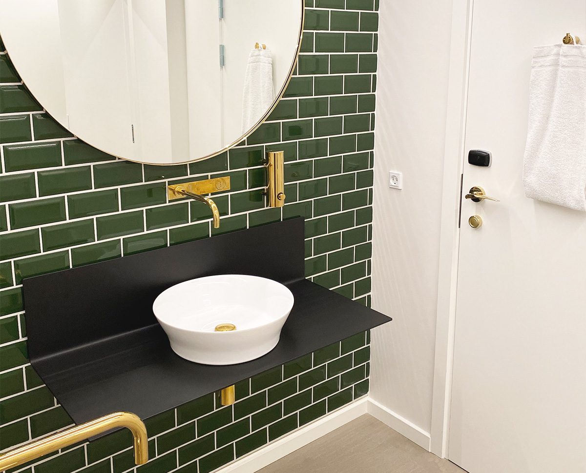 ANDERSEN HOTEL is an inspiring boutique hotel located in the pulsating district Vesterbro. The hotel has designed their bathrooms with a complete solution of our NOVA2 series, Care collection, UNU Wash table, and the 4031 Mirror. The consistent choice of Polished Gold finish complements the green tiles creating a balanced and modern expression.